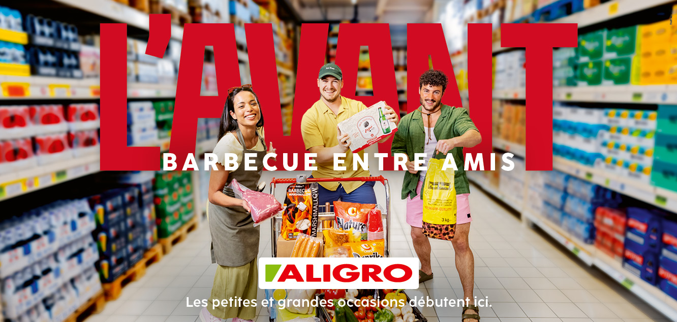 Les clients font donc leur courses en se projetant déjà dans l’ambiance de la réception programmée. Ils adoptent une attitude et portent des accessoires qui nous plongent immédiatement dans la thématique de la fête à venir, soit un brunch, un barbecue, un apéro ou une raclette. Dans le Marché Aligro, on les voit graviter autour d’un caddie chargé ou porter des produits à bout de bras, dans une atmosphère complice, décontractée et légèrement décalée.